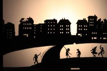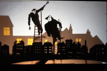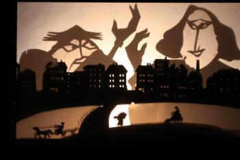 Das Schattenstück ist eine Bildcollage, die mit den Elementen der Erinnerung spielt, mit Bildern aus Träumen, Märchen, Wünschen und Visionen aus der Zeit der Kindheit des jüdisch-polnischen Schriftstellers Isaac Bashevis Singer im jüdischen Armenviertel von Warschau um 1900.